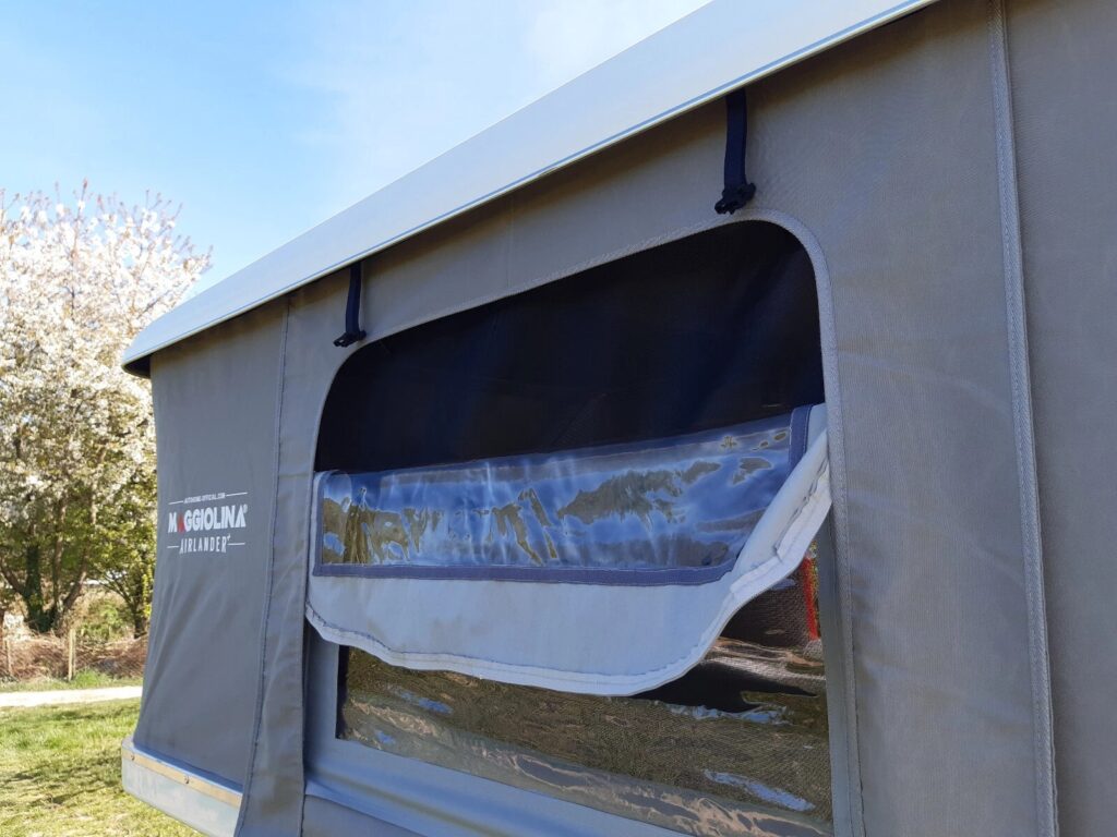 Neukauf 1/2020; Maße: Medium, extra lang 230x 145x 92 (Lx Bx H); Farbe Schale weiß; Stoff carbon; Standard-Leiter; 2 Eingänge + 2 Fenster, Moskitonetze an allen Fenstern, Hängetaschen, LED-Deckenleuchte